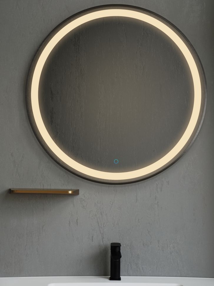 RONDA е кръгло огледало с вградено LED осветление и алуминиева рамка с покритие черен мат.