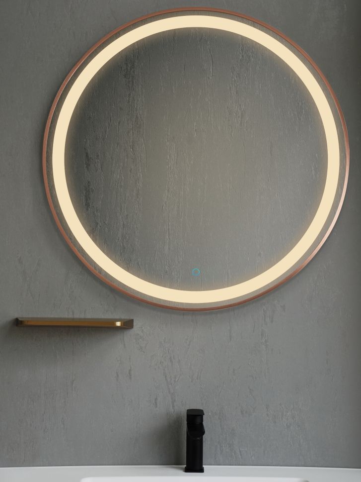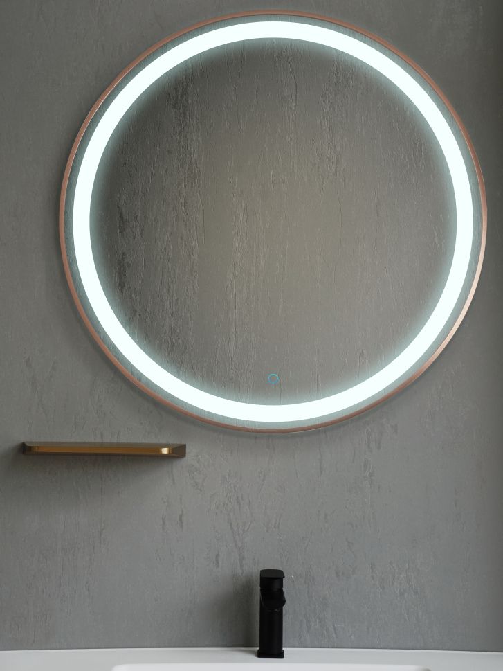 RONDA е кръгло огледало с вградено LED осветление и рамка с матожо розово злато.