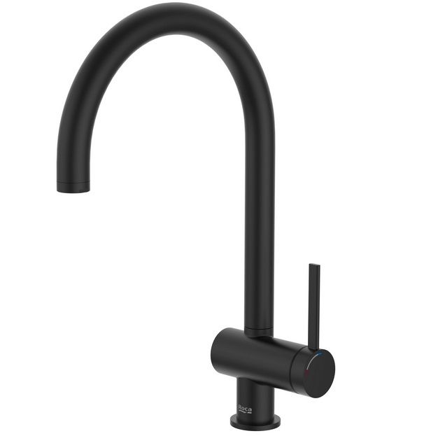 ONA е смесител за кухненска мивка с извит въртящ се чучур от едноименната колекция на Roca с покритие черен мат.