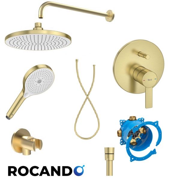Душ-система за вграждане от Roca, изпълнена със смесител TARGA GOLD MAT и душ пита RAINSENSE Ф 230..