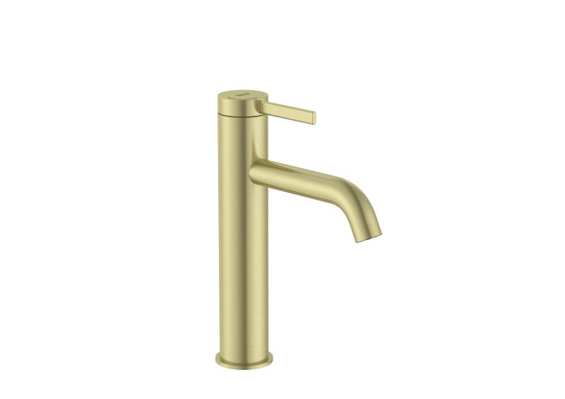 ONA Смесител средна височина за умивалник с клик-клак клапа в матирано злато на испанския производител Roca.