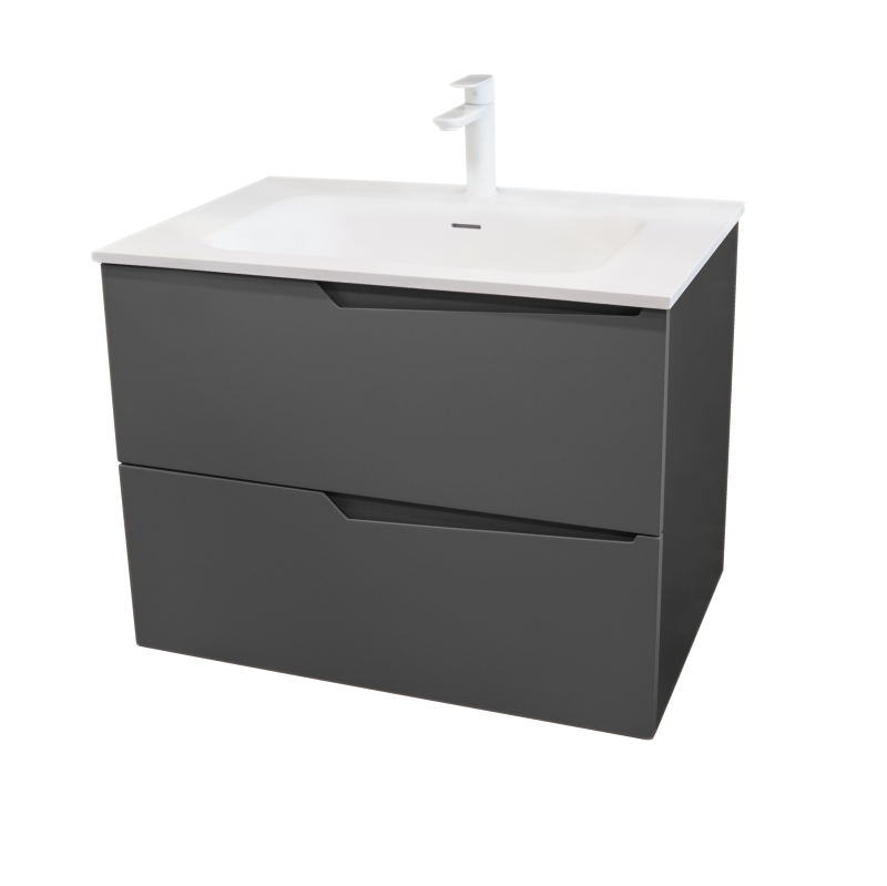 CANBERRA GREY е мебел за стенен монтаж с интегриран умивалник, изработен от висококачествени материали с чекмеджетата, целия в матово покритие. Има изключително висока степен на водоустойчивост. Размерите са 700 / 470 / 540. Механизмите са с плавно затваряне и пълно изтегляне навън.