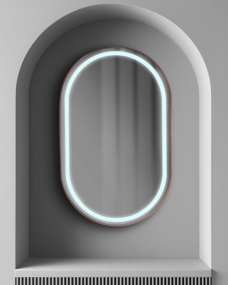 GRANADA е овално огледало с вградено LED осветление и матова рамка в цвят розово злато.