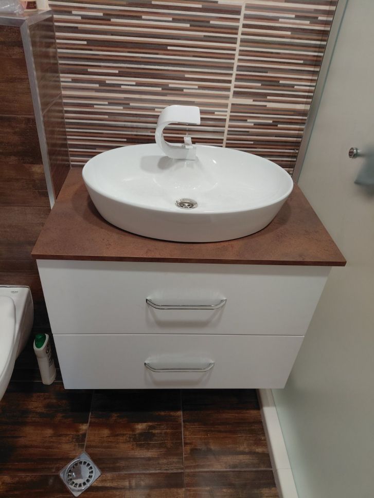 Мебелът е с плот за умивалник тип "купа", като големината и вида на умивалника определят и местоположението на смесителя - при този умивалник има място с отвор за смесителя . Изработва се с размери на клиента, като е възможен и компактен модел, при който дълбочината на плота е до 36 см. Мебелът е с две чекмеджета с механизми плавно затваряне, а отварянето е с елегантни хромирани дръжки в горната част на всяко чекмедже. разполагаме с избор на вида на дръжките за мебелите.