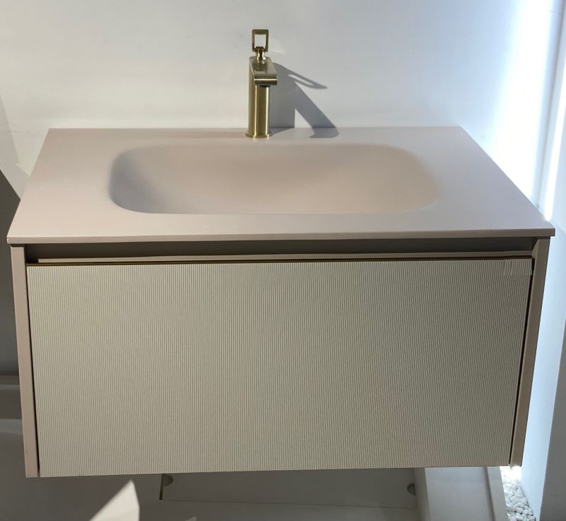 PINKO e мебел за баня от ПВЦ с цвят, избран от каталога NCS с матово покритие и релеф на фасадата на чекмеджето.