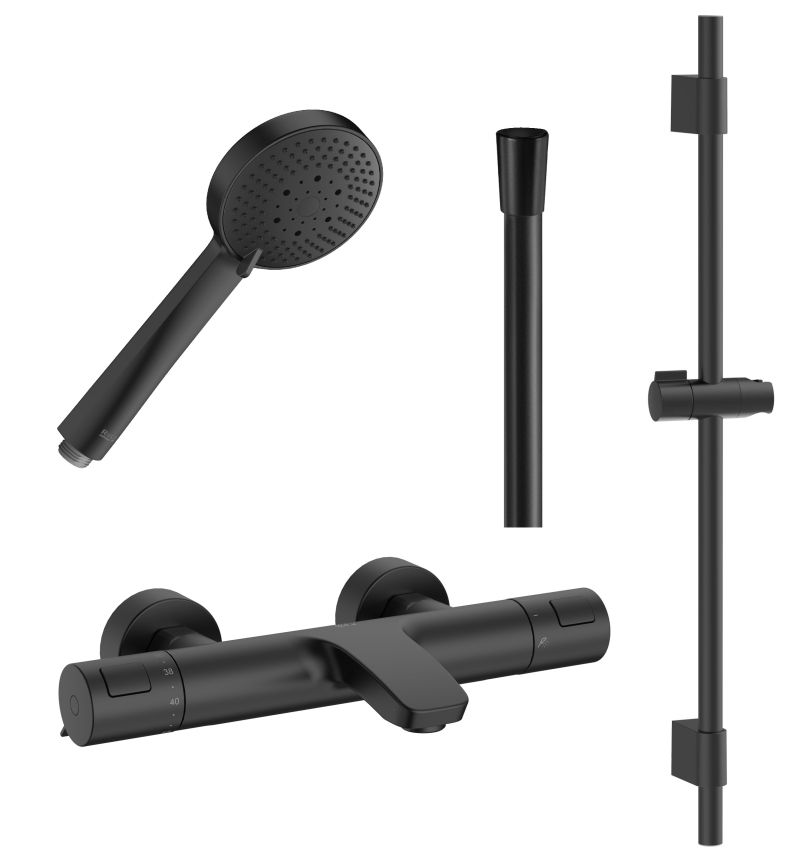 Душ-система от Roca, изпълнена със термостатичен смесител T-500, тръбно окачване, шлаух и душ-слушалка STELLA с три функции и покритие BLACK MATT, решени в кръгли форми.
