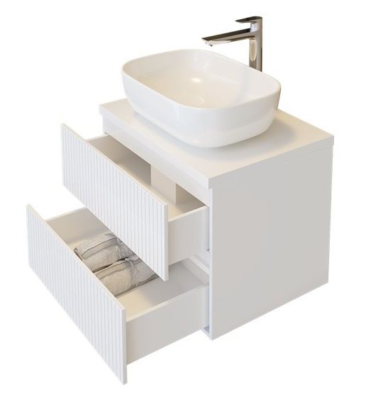 PVC Долен шкаф с две чекмеджета за баня на българския производител TRIANO е изработен от 100% водоустойчив PVC материал, устойчив на влага и деформации, което гарантира дълъг експлоатационен живот и безпроблемна употреба в банята.