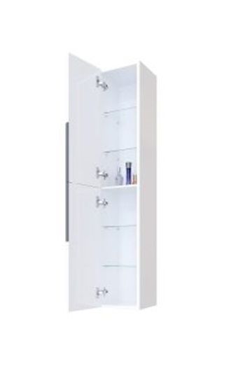 Водоустойчива колона за баня с две врати с плавно затваряне и четири стъклени рафта, които предлагат много пространство за съхранение на козметика и тоалетни принадлежности.
